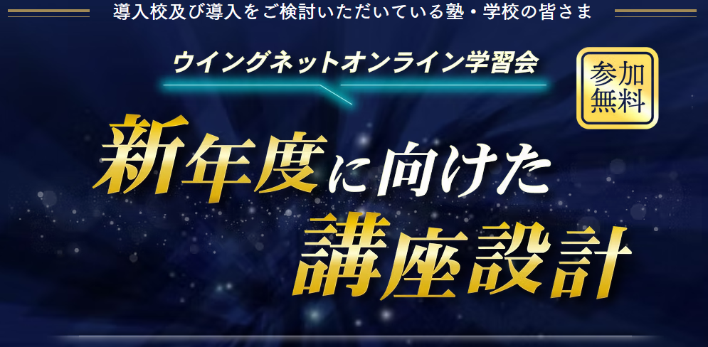 ウイングネットでは、皆さまの新年度体制づくりのお力になるべく、「新年度に向けた講座設計」をテーマにした11月のオンライン学習会を実施いたします。新年度に向けて講座設計やシステム運用方法のご提案と、システム・コンテンツの活用事例をご紹介いたします。